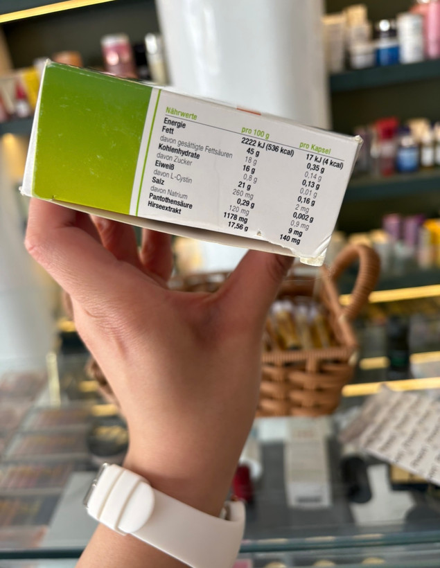 تعداد کپسول ها ۳۰عدد ورقه ای بسته ای ۱۲۰عدد/فول تاریخ/ساخت آلمان/وگان /مناسب پوست و مو /این کپسول بعد صبحانه و بعد مصرف کافئین باید مصرف بشه